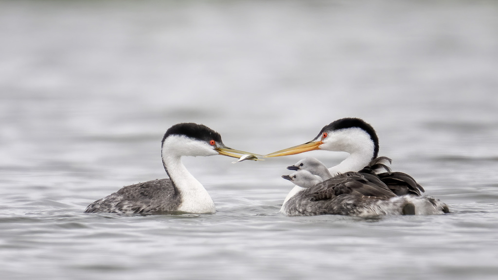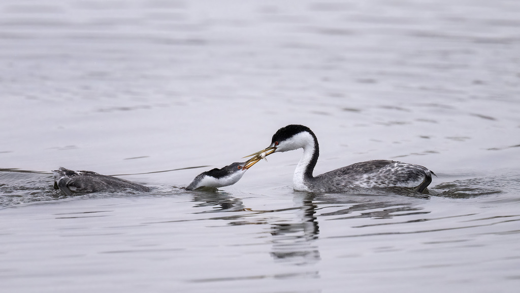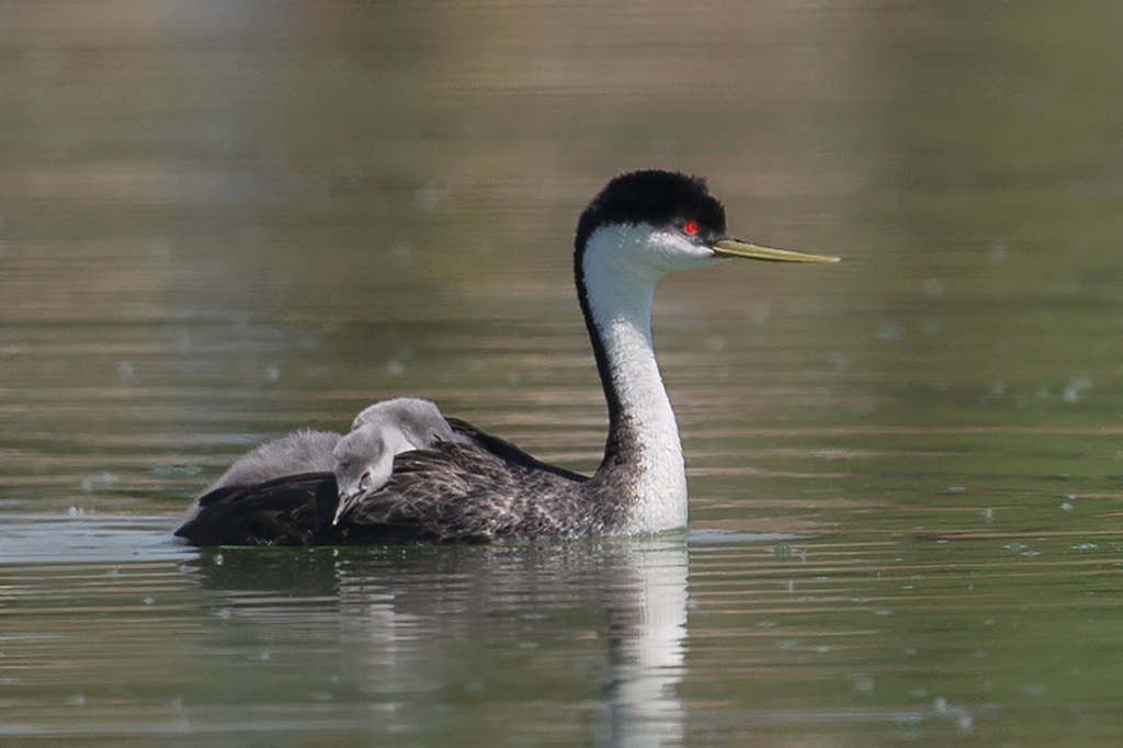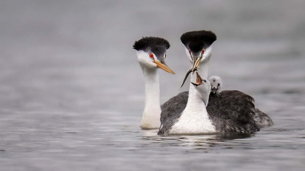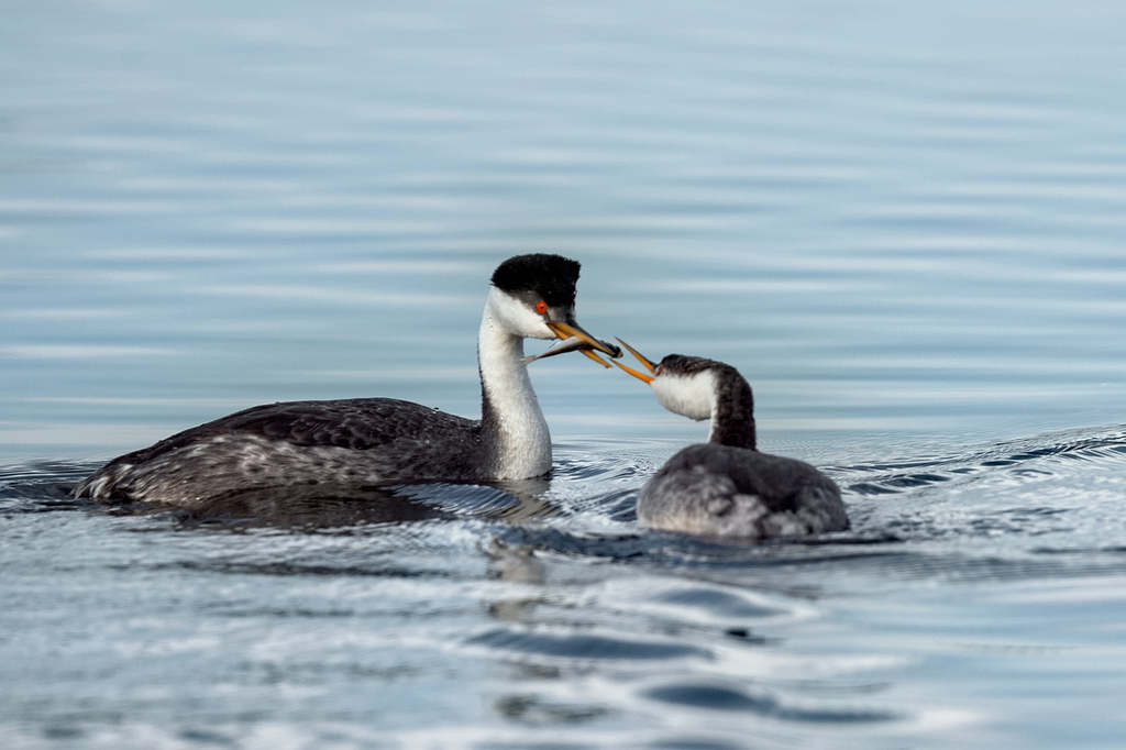 Western grebes are crisp black and white with a sharp transition between black and white extending down the neck. They spent most of the time in the water, hunting for small fishes, and the female carried her babies on her back.
