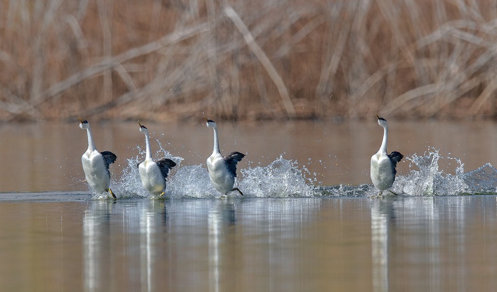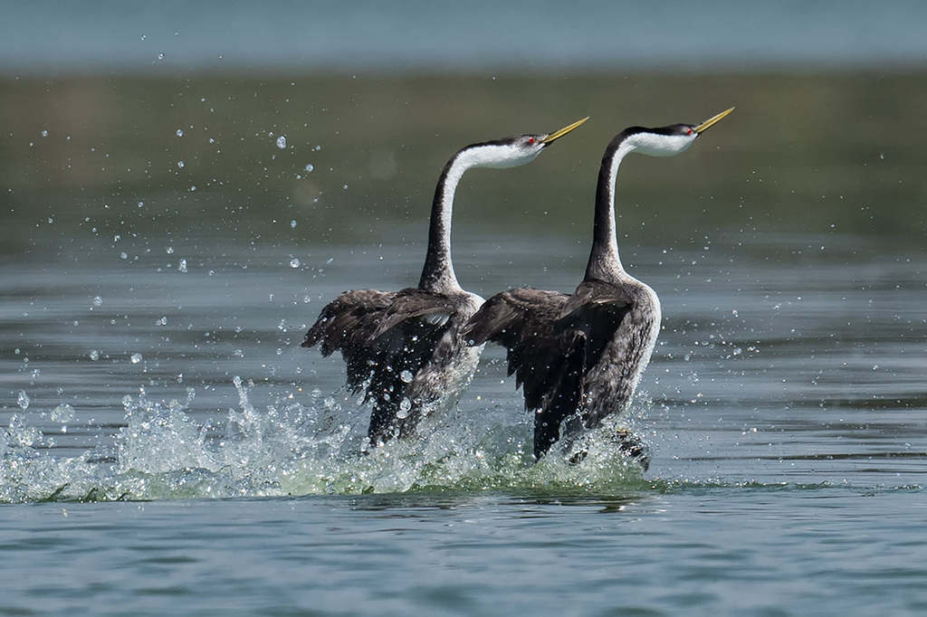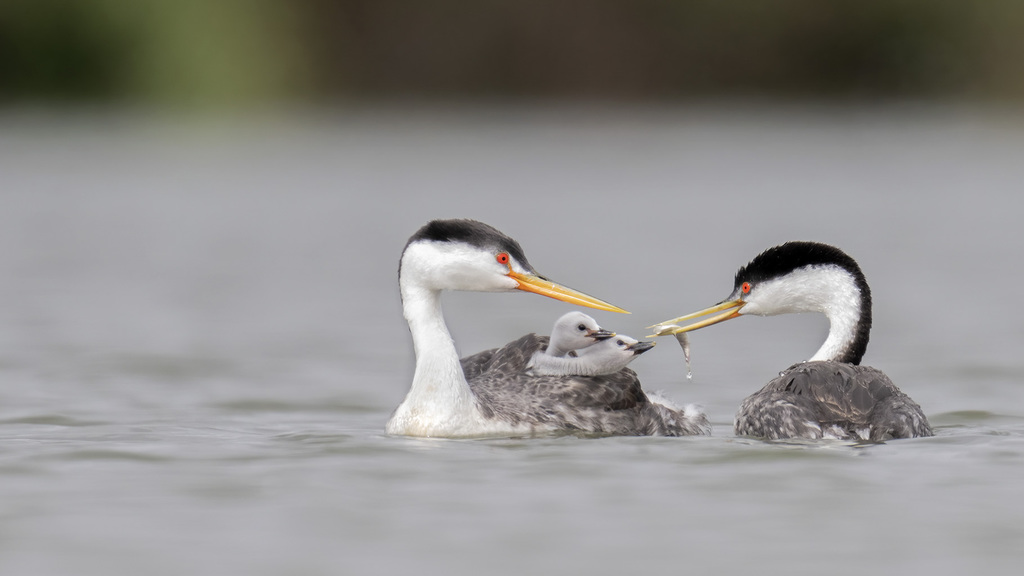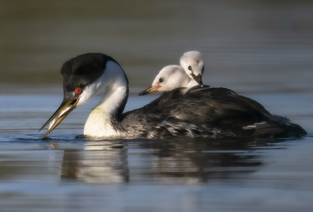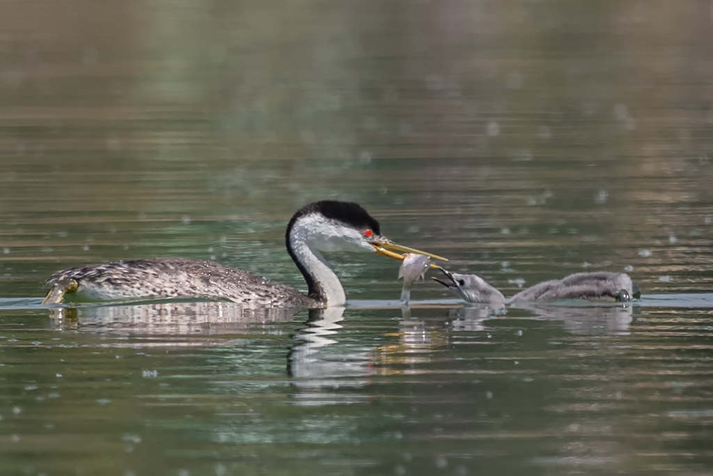 Western grebes are crisp black and white with a sharp transition between black and white extending down the neck. They spent most of the time in the water, hunting for small fishes, and the female carried her babies on her back.